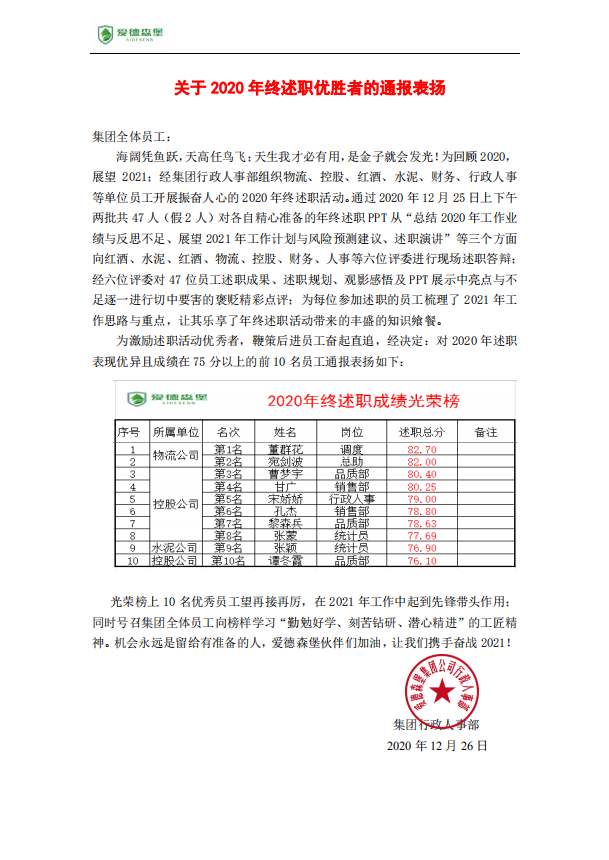 關(guān)于2020年年終述職優(yōu)勝者的通報(bào)表揚(yáng)