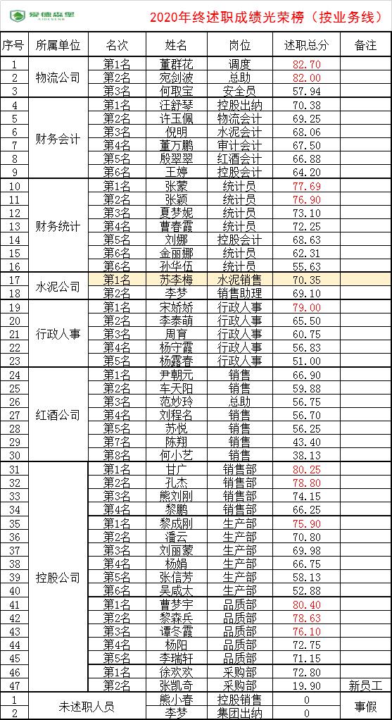 2020年終述職活動給參加的員工帶來了一場拓展知識、提升眼界的饗餐盛宴。因為它有利于公司團(tuán)隊人才建設(shè)、有利于提升領(lǐng)導(dǎo)者的管理水平,有利于公司挖掘出人才。為激勵述職活動優(yōu)秀者、鞭策述職后進(jìn)員工奮起直追。經(jīng)集團(tuán)人事部三位成員細(xì)心、仔細(xì)的復(fù)核六位評委述職評分?jǐn)?shù)據(jù),最終于2020年12月26日公布了述職活動中“狀元、榜眼、探花”等,他/她們是董群花、宛劍波、曹夢宇、甘廣、宋嬌嬌、孔杰、黎森兵、張蒙、張穎、譚冬霞等十名優(yōu)勝者,具體詳見排名表。集團(tuán)公司號召全體員工向“榜樣”學(xué)習(xí)“勤勉好學(xué)、刻苦鉆研、潛心精進(jìn)”的工匠精神。機(jī)會永遠(yuǎn)留給有準(zhǔn)備的人,愛德森堡伙伴們一起弘揚(yáng)中國女排精神,讓我們攜手奮戰(zhàn)2021!