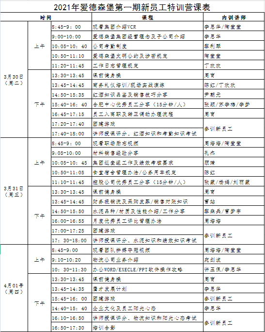 為使新員工深入了解公司文化,快速融入工作環(huán)境,增強歸屬感與責任感。集團行政人事部于2021年03月30日-4月01日在集團總部會議室組織開展了三天的“新員工特訓營活動”。本次培訓活動針對新員工、分享嘉賓及內(nèi)訓講師通過參訓大眾匿名評分、現(xiàn)場互動加減分、課后知識點測評考試等多緯度評審,分別誕生了狀元、榜眼、探花等新秀及金銀銅牌內(nèi)訓講師,現(xiàn)將成績公示如下: