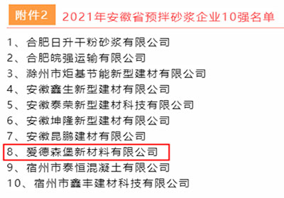 9月中旬,安徽省經(jīng)濟(jì)和信息化廳公布了2021年安徽省預(yù)拌混凝土企業(yè)20強(qiáng)和預(yù)拌砂漿企業(yè)10強(qiáng)名單,愛德森堡第二次入圍,榮獲安徽省預(yù)拌砂漿企業(yè)十強(qiáng)。